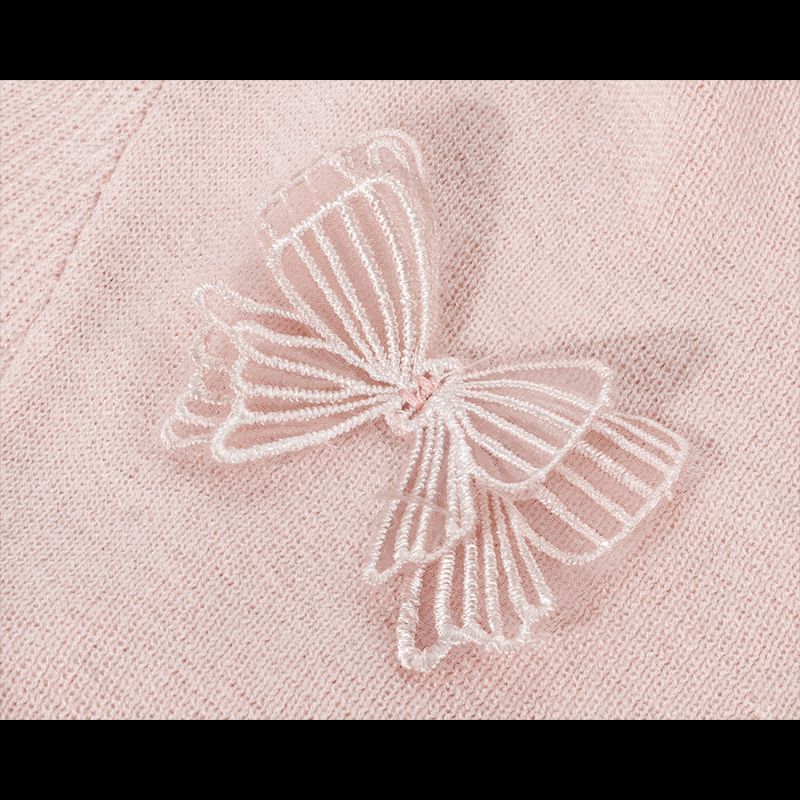 Delicate 3D butterfly embellishments add texture and dimension, creating a standout detail that feels youthful, romantic, and effortlessly chic. The soft pink hue brings a fresh, radiant touch to your wardrobe, perfect for styling from day outings to evening looks.